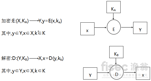 明文X经密钥KA经过加密算法E成为密文Y,同理,密文Y经密钥KB由解密算法D成为明文X。其中加密算法E用密钥KA、解密算法D用KB。加密算法E和解密算法D可以是一样的,如椭圆加密算法。